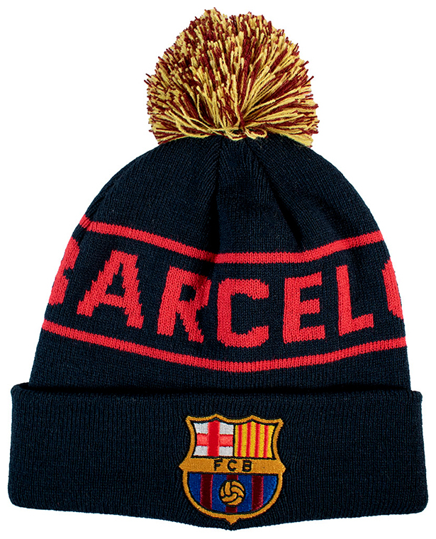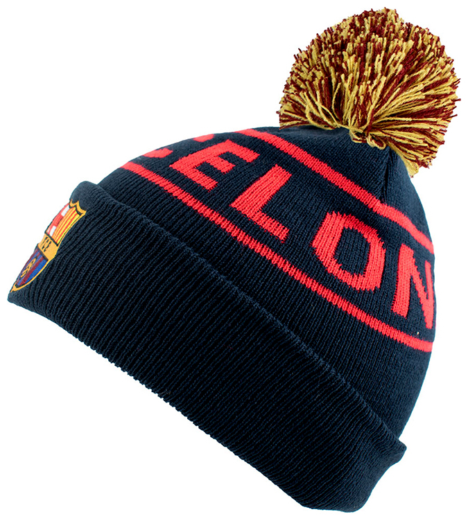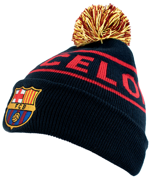 Har en flerfärgad bobblehatt med ett broderat FCB-emblem
