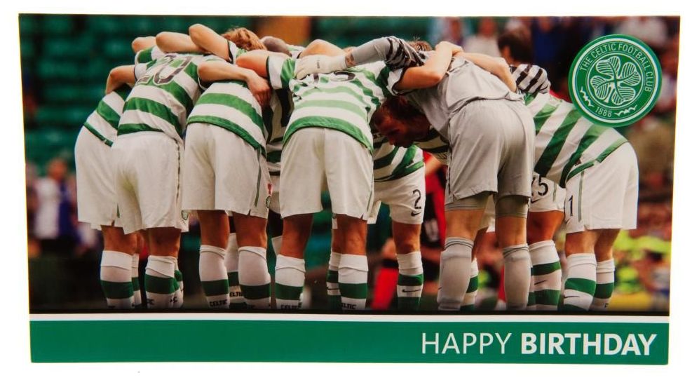 Önska någon en fantastisk födelsedag med Celtic Gratulationskort Huddle! Detta officiellt licensierade kort har en glansig finish och visar upp spelarna i den berömda Celtic FC Huddle.