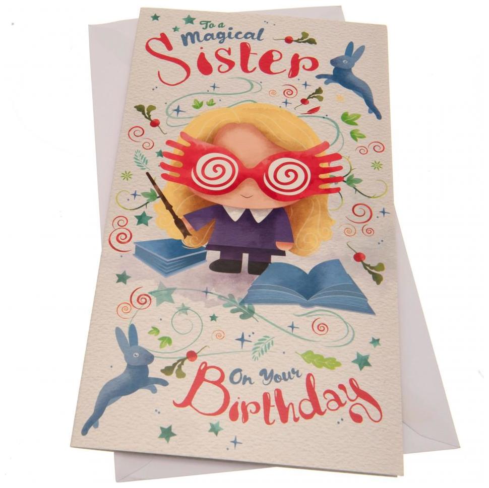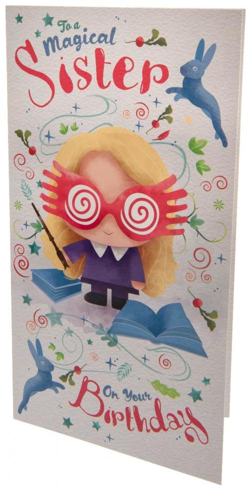 Önska din syster en magisk födelsedag med detta färgglada Harry Potter Födelsedagskort Sister! Kortet har en glansig finish och visar en tecknad bild av Luna Lovegood.