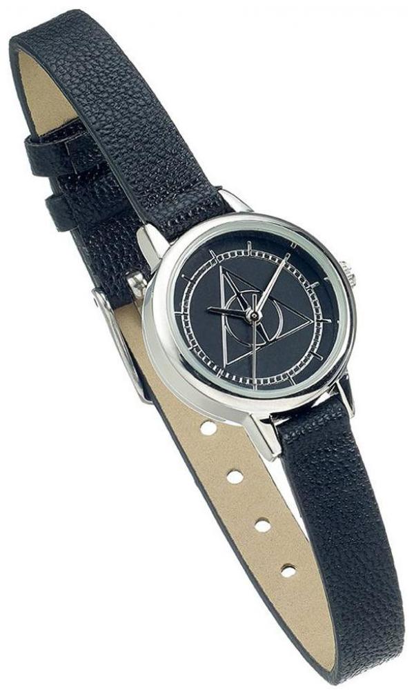 Klockan har en svart falsk läderrem med en silverpläterad spänne och en urtavla som har en silverpläterad omgivning med den ikoniska symbolen Deathly Hallows.