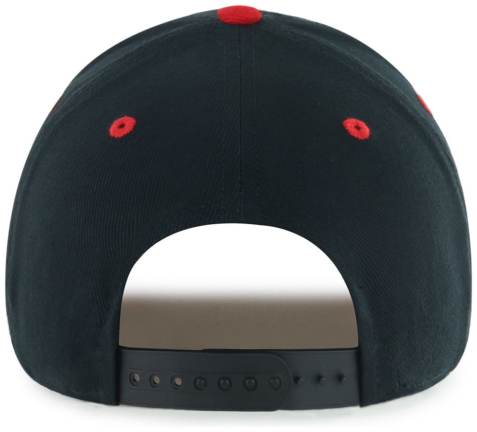 Den här svarta kepsen med böjd skärm har kontrasterande röda öljetter och sömdetaljer.