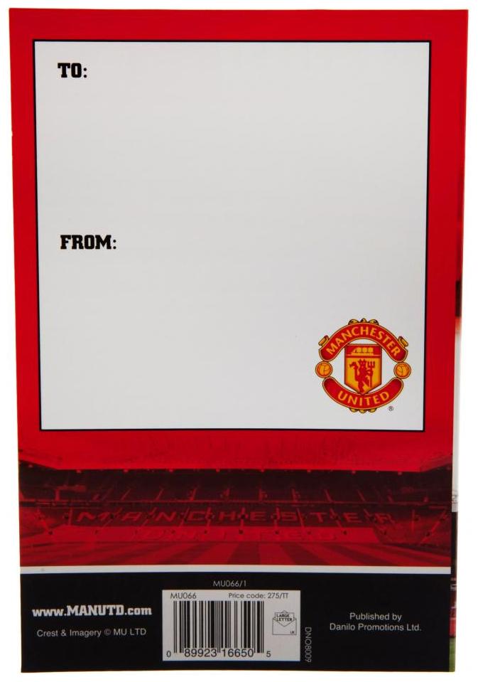 Överraska en Manchester United-fan med detta fantastiska gratulationskort! Detta officiellt licensierade kort har klubbens färger och en glansig finish som ger en extra touch av elegans.