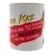 Muggen har en vit bakgrund med Cobra Kai-logotypen och sloganen tryckt på den.