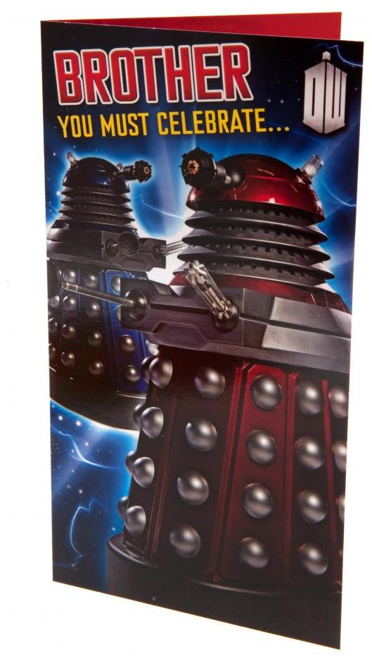 Överraska din bror på hans födelsedag med detta färgglada Doctor Who födelsedagskort! Kortet har en glansig finish och visar två Daleks på framsidan med texten "Brother You Must Celebrate...".
