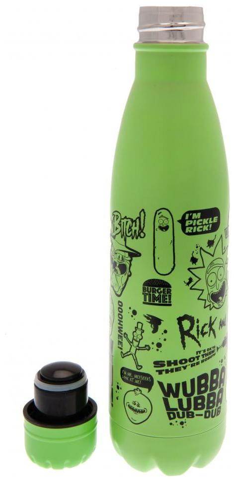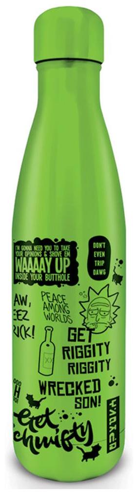 Flaskan har en matt grön finish och är prydd med en häftig Rick and Morty-infografik.