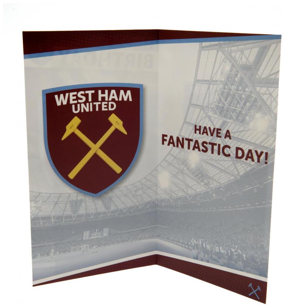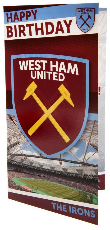 Önska en West Ham United-fan en fantastisk födelsedag med detta officiella födelsedagskort! Kortet har en elegant claret och blå högglansig finish och pryds av en stor färgglad West Ham-klubbmärke och en grafisk bild av deras legendariska stadion.
