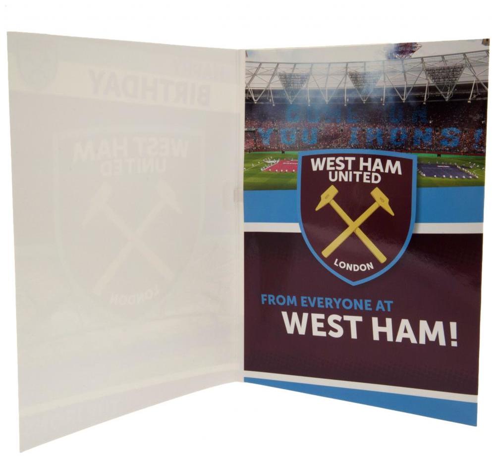 Men det är inte allt - när mottagaren öppnar kortet kommer den berömda Im Forever Blowing Bubbles West Ham-anthem att spelas! Inuti kortet finns en färgglad stadiongrafik och ett meddelande som lyder "Från alla på West Ham!".